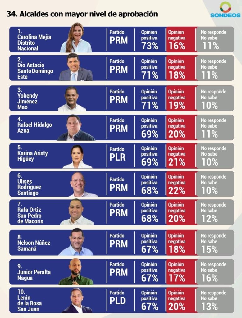 Luego de Mejía, en la medición se ubican en el top 5 sus homólogos Dío Astacio, de Santo Domingo Este; Yohendy Jiménez, de Mao; Rafael Hidalgo, de Azua; y Karina Aristy, en Higüey.